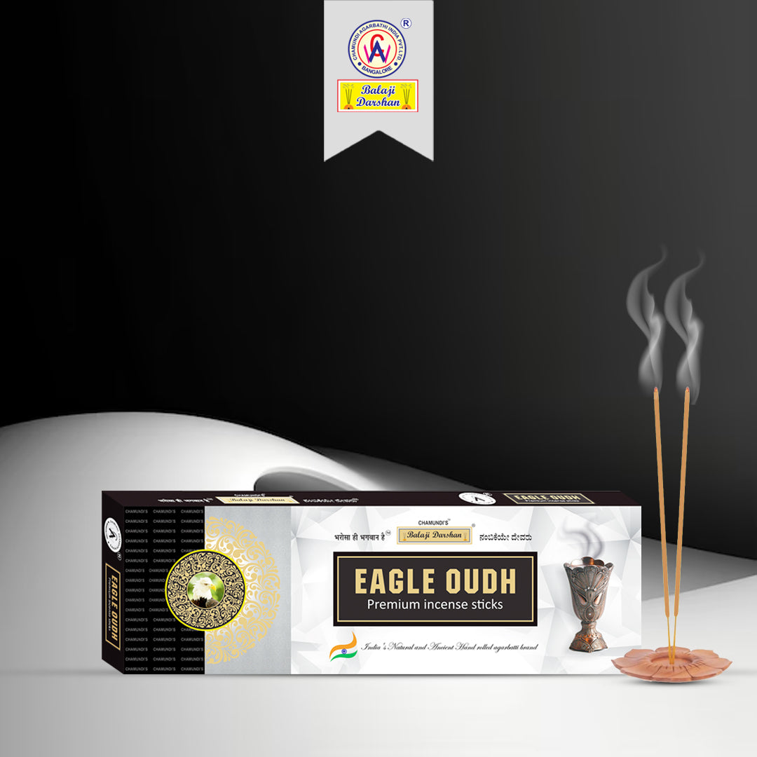 EAGLE OUDH is a natural, hand-rolled agarbathi made with pure halmaddi. Infused with rich oudh fragrance, it offers a calming, long-lasting aroma ideal for meditation, prayer, and creating a serene, luxurious atmosphere at home or work.